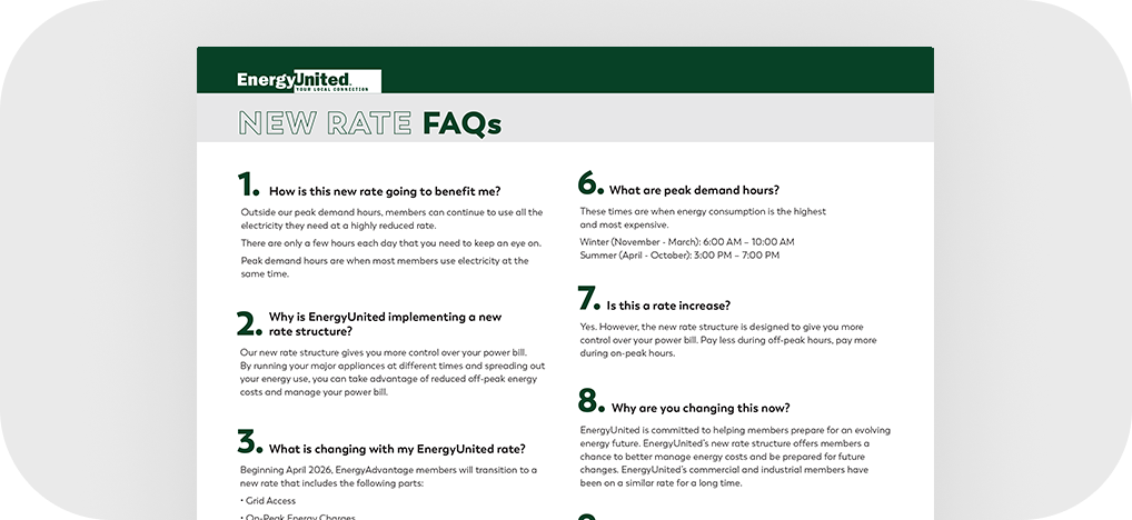 Beginning April 2026, EnergyUnited is implementing a new rate structure to offer members direct control of their power bill.